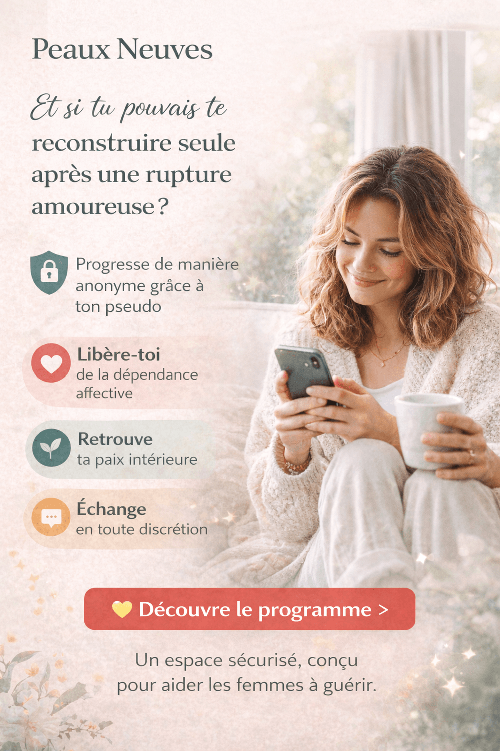 Le programme te guide pas à pas pour apaiser ton système nerveux, comprendre tes mécanismes affectifs, recoller les morceaux à l’intérieur… et retrouver une stabilité émotionnelle durable.